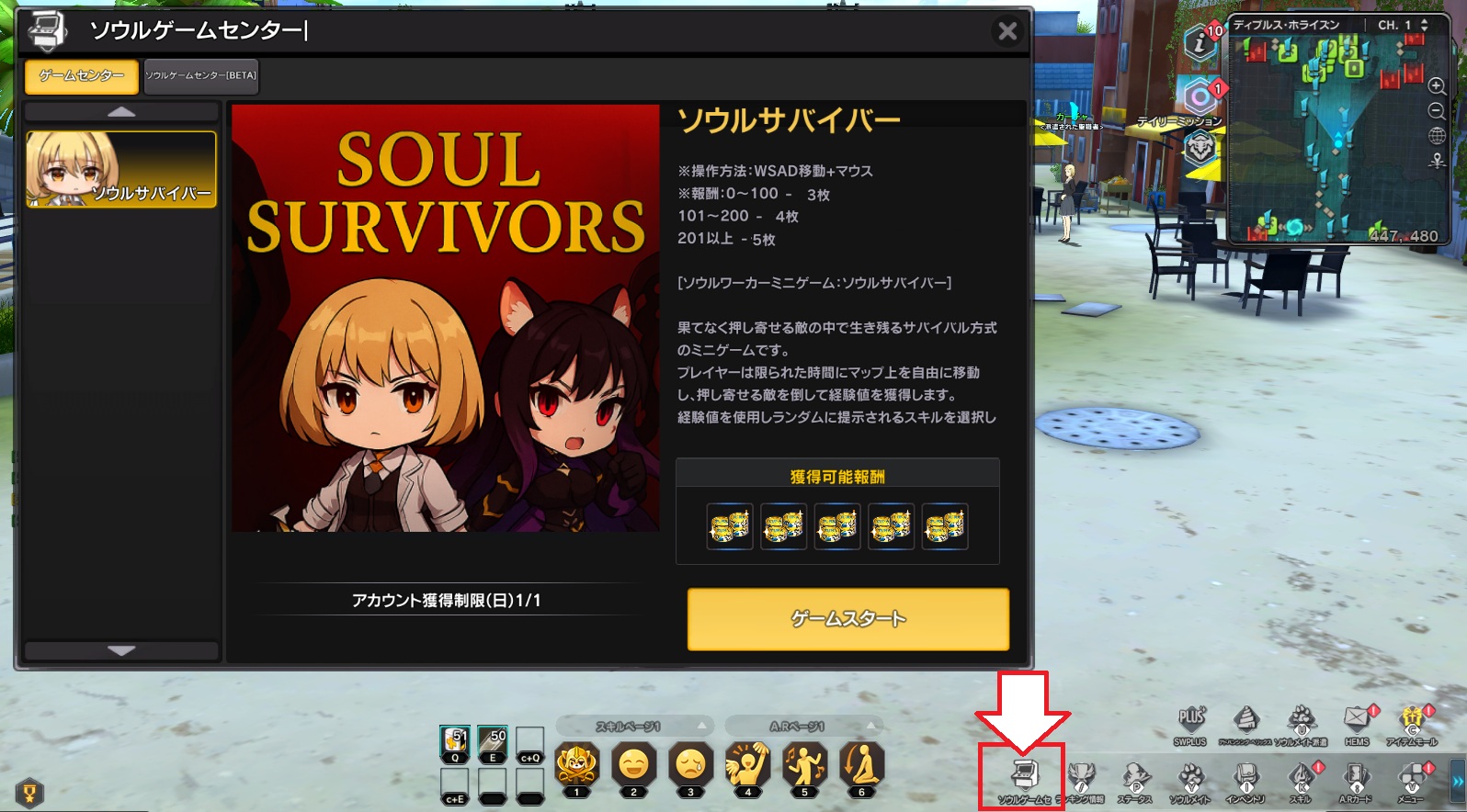 ▼画面下部の「ソウルゲームセンター」アイコンから「ソウルサバイバー」をプレイしましょう。