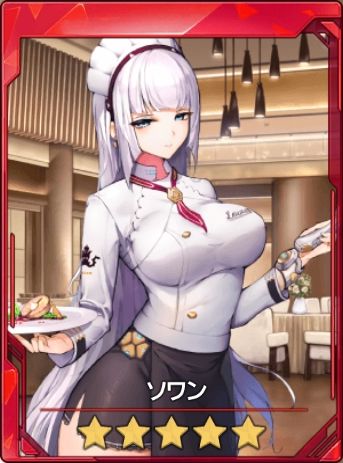 【HOLD】タイプ ※μ+2まで強化できます。 ※★5「クロエ」と同じ能力/装備制限となります。 【カード獲得時】 装備時、10秒ごとにSVを6獲得し、5秒間攻撃力が800増加します。 【μ+2強化時】 装備時、10秒ごとにSVを11獲得し、5秒間攻撃力が1800増加します。 |